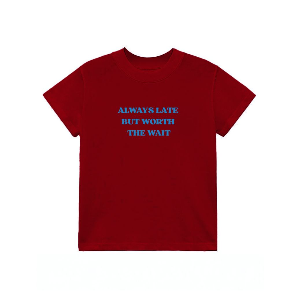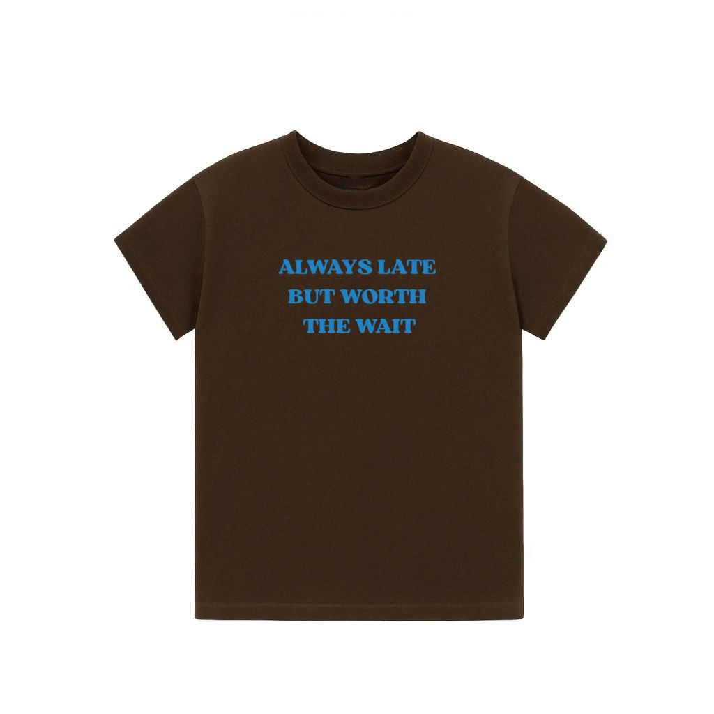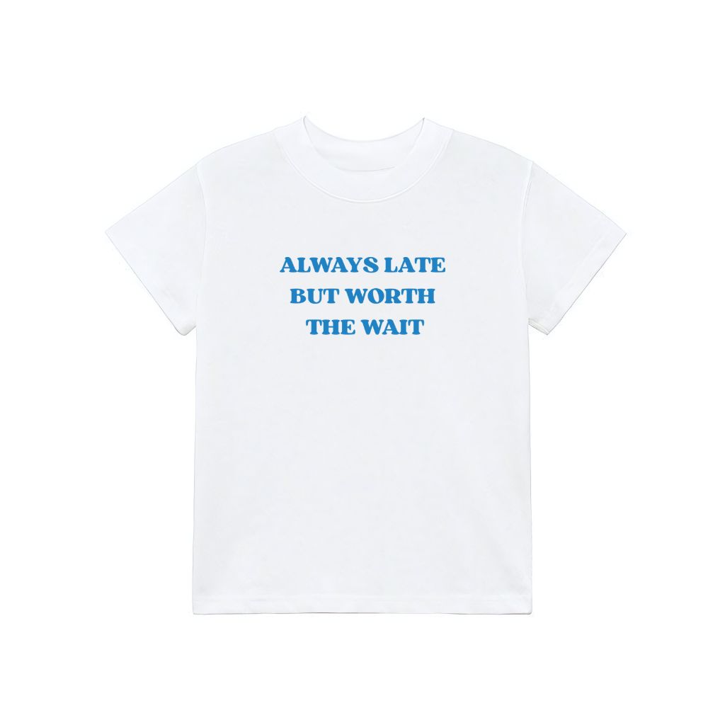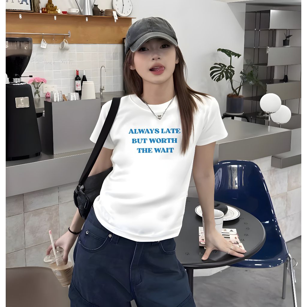 Chiếc áo thun Babytee với thông điệp “ALWAYS LATE BUT WORTH THE WAIT” mang đến vẻ ngoài năng động, trẻ trung, cực kỳ phù hợp để diện đi học, đi chơi hay cafe cùng bạn bè.