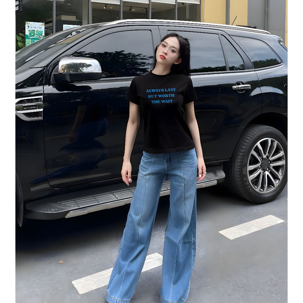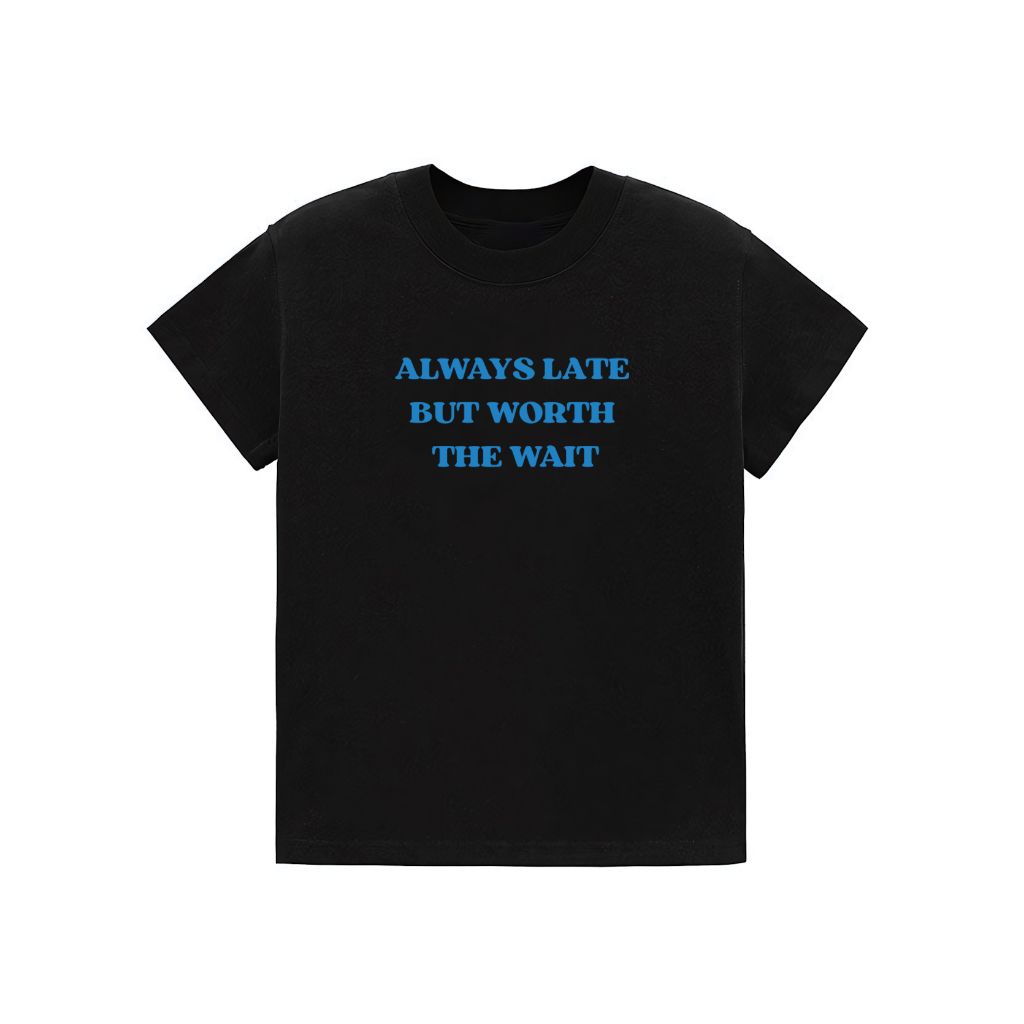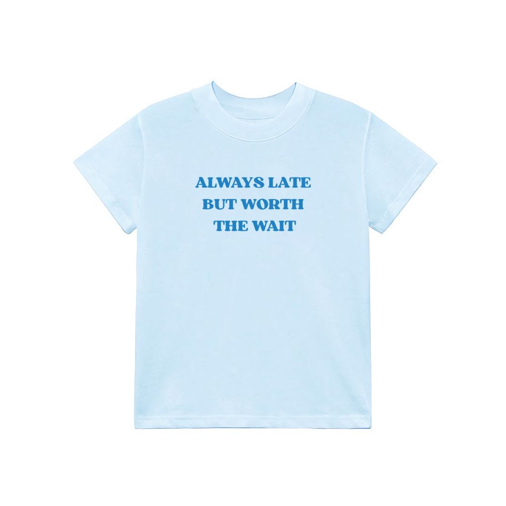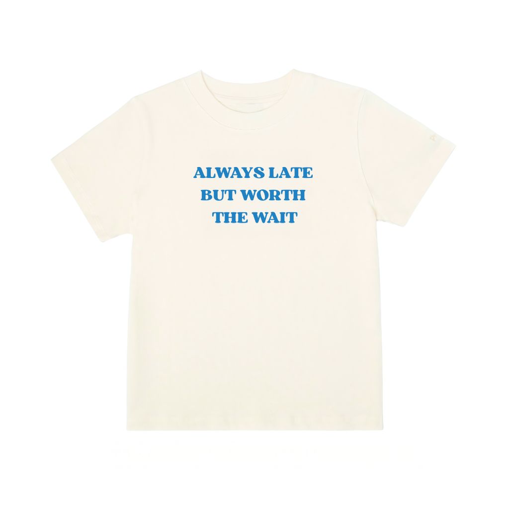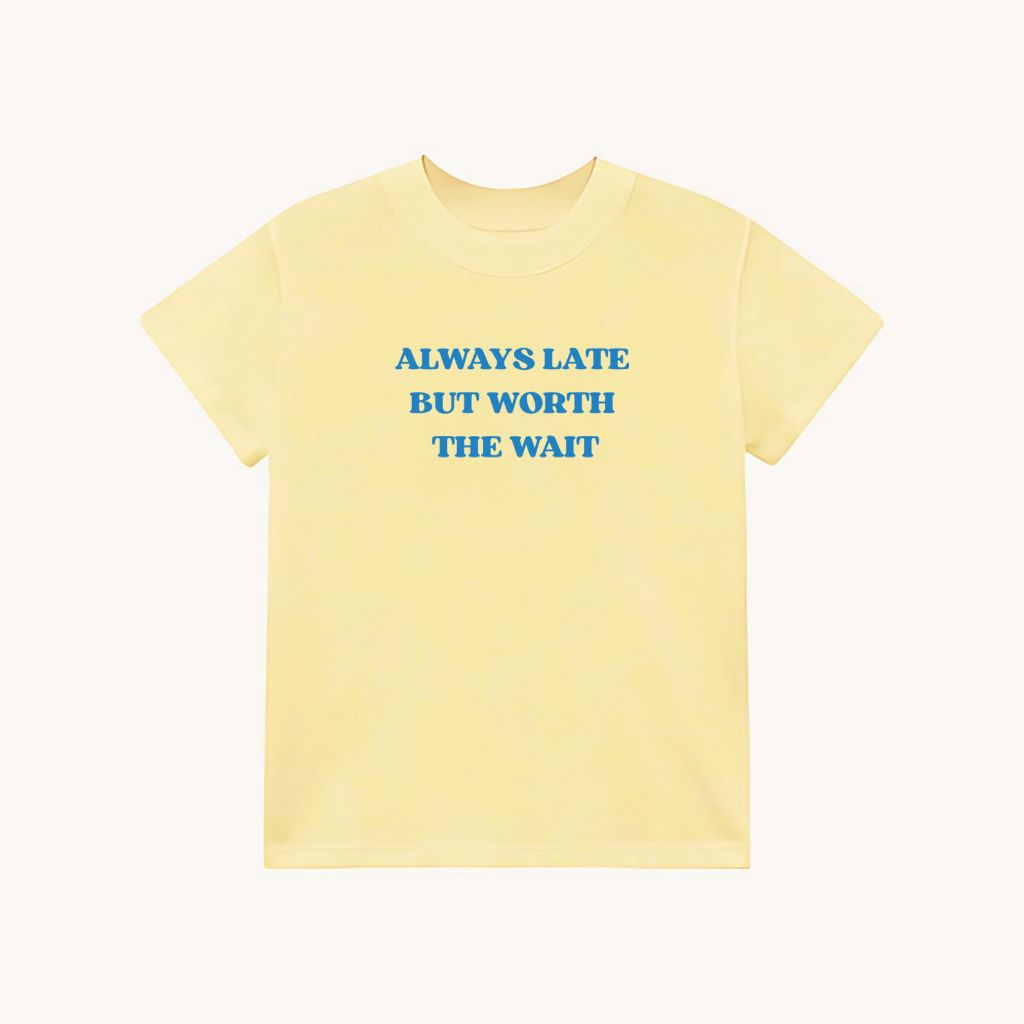 Chiếc áo thun Babytee với thông điệp “ALWAYS LATE BUT WORTH THE WAIT” mang đến vẻ ngoài năng động, trẻ trung, cực kỳ phù hợp để diện đi học, đi chơi hay cafe cùng bạn bè.