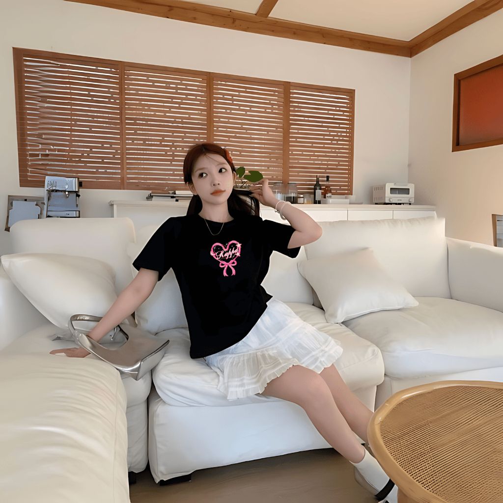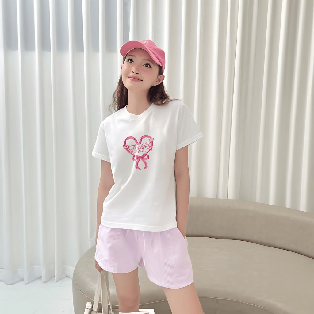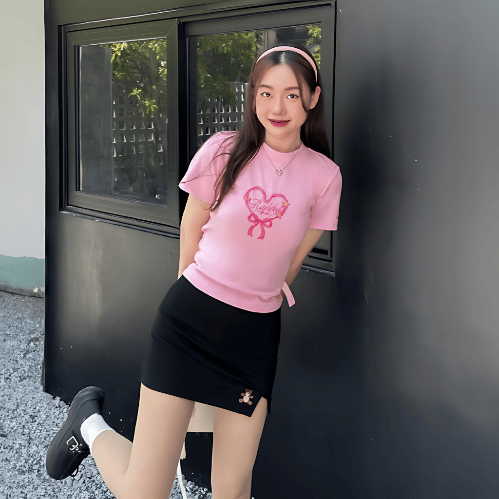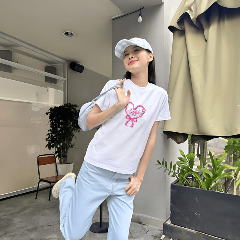 Chiếc áo thun babytee với họa tiết nơ trái tim ngọt ngào mang đến vibe trẻ trung, năng động, cực kỳ phù hợp cho những buổi đi học, cafe hay dạo phố cùng bạn bè.
